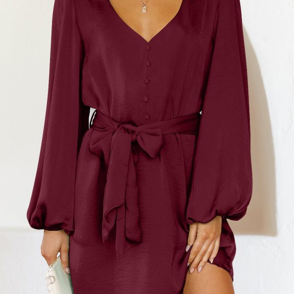 V Neck Long Puff Sleeve Belted Short Party Dress