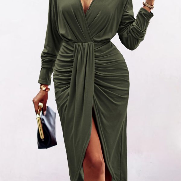 Women’s Ruched Wrap V Neck Split Hem Draped Front Bodycon Dresses
