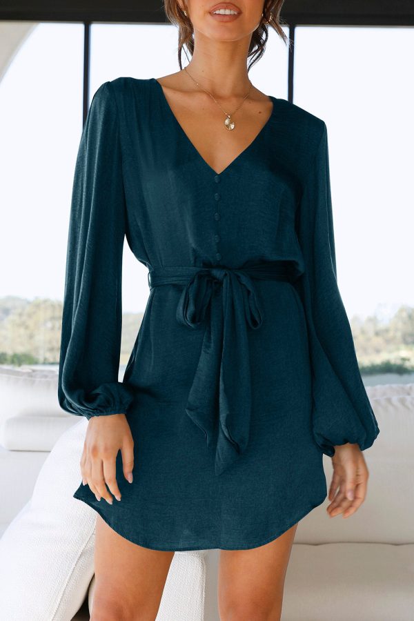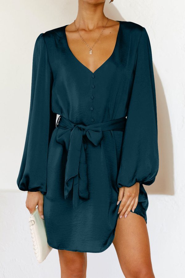 V Neck Long Puff Sleeve Belted Short Party Dress quantity