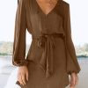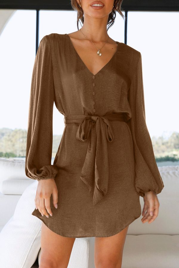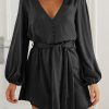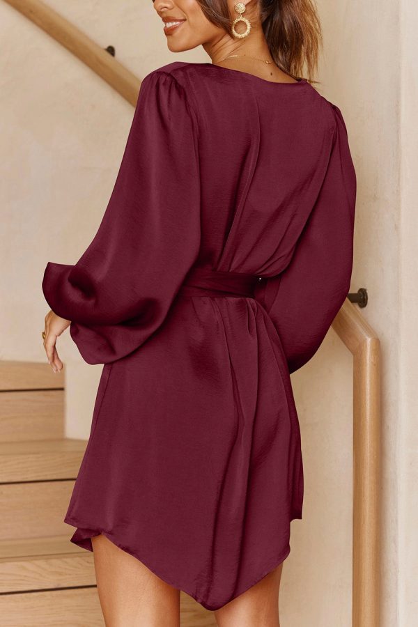 / V Neck Long Puff Sleeve Belted Short Party Dress