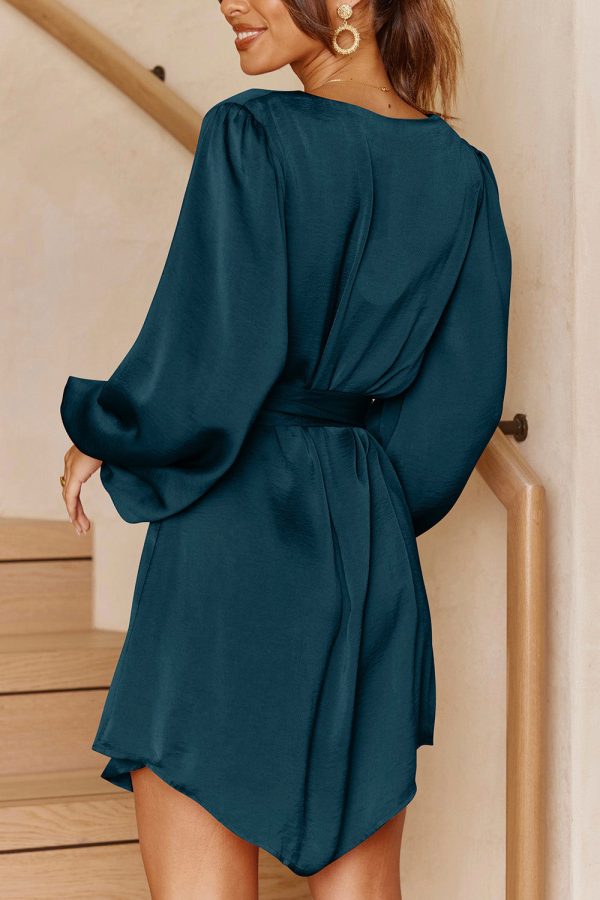 V Neck Long Puff Sleeve Belted Short Party Dress