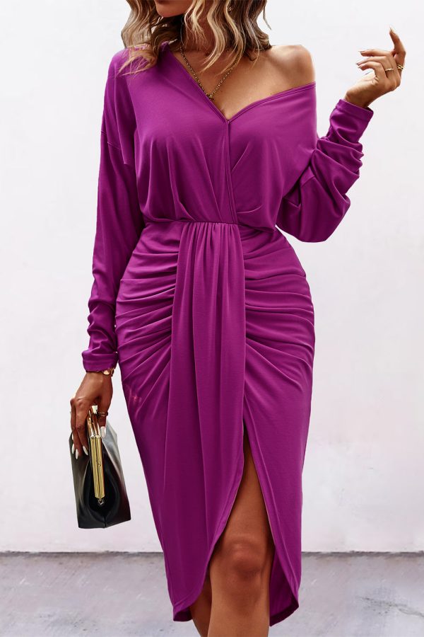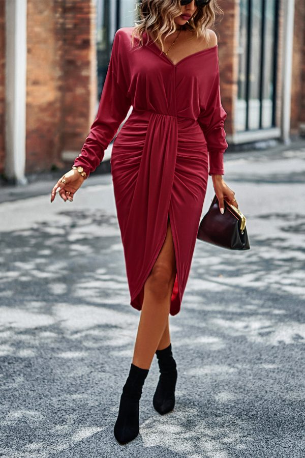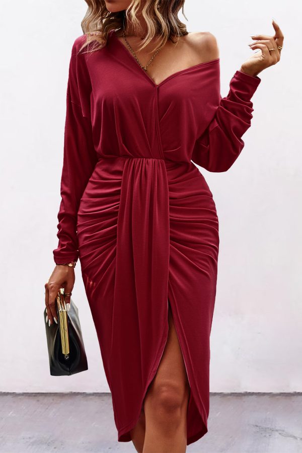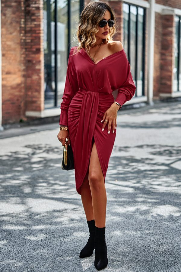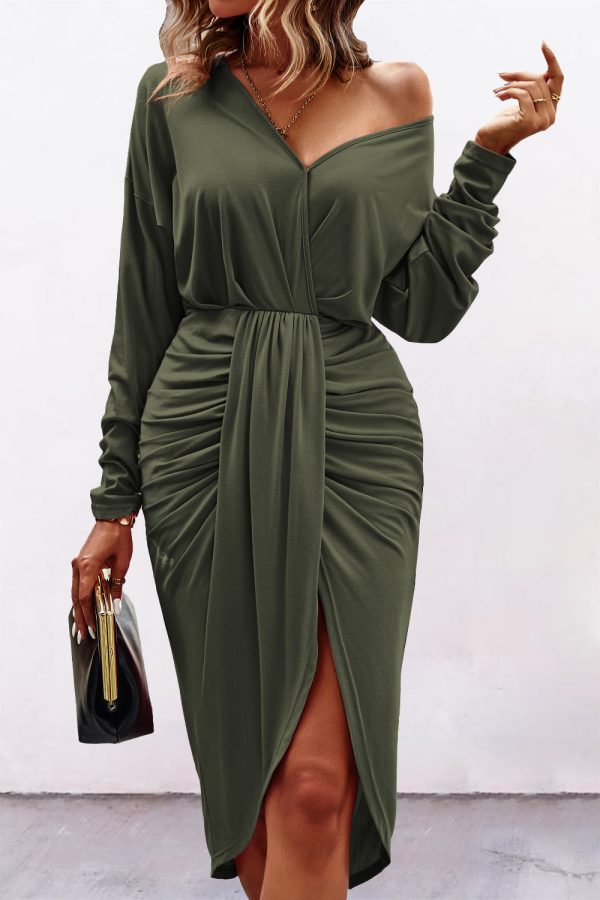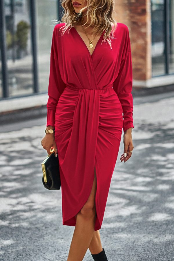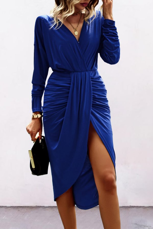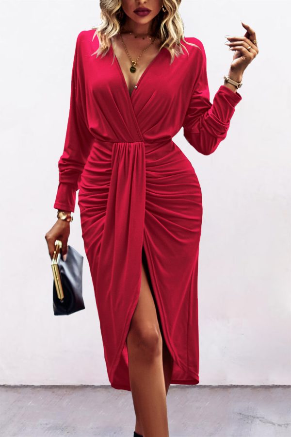 Women’s Ruched Wrap V Neck Split Hem Draped Front Bodycon Dresses