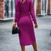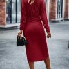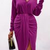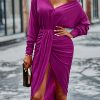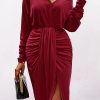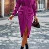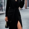 / Women’s Ruched Wrap V Neck Split Hem Draped Front Bodycon Dresses